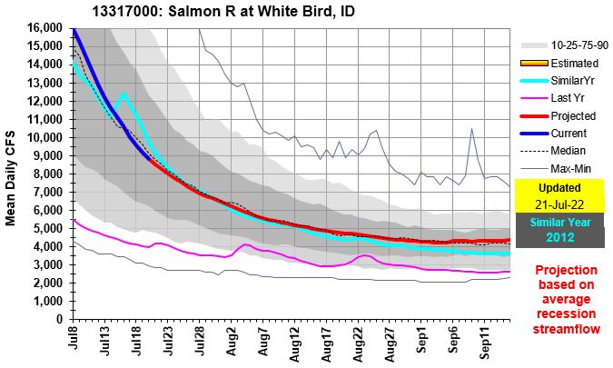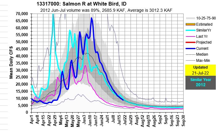 Looking at average flows. Very similar to 2012 and much better than last year, 2021. With the dry summer weather here, and I have not seen any indicators that precipitation will change to wetter or even normal. Expect this year to drop faster than 2012 until late summer rain occur or cooler temperatures arrive to reduced water up take by vegetation. You can see the long term average trying to increase in September.