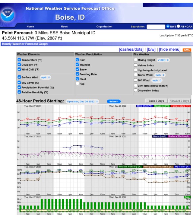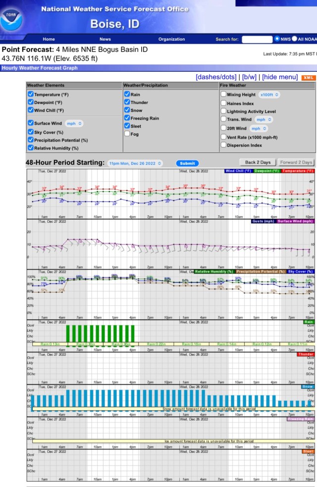 Above NWS hourly temp and precip outlook for my Boise house and for Bogus below.