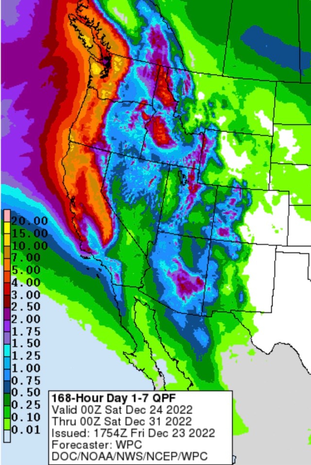 7-day total precipitation for Dec 24-31. And OpenSnow outlook for start of the new year. Happy New Year 2023 !!!