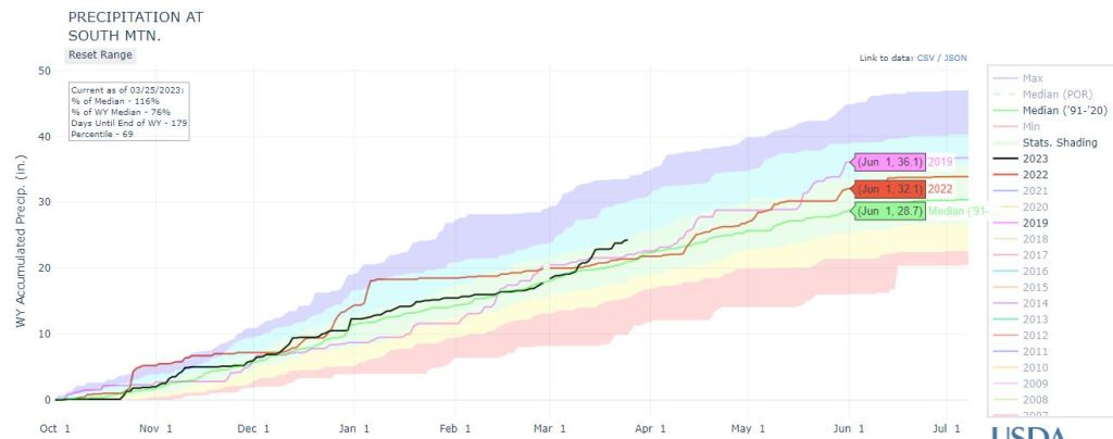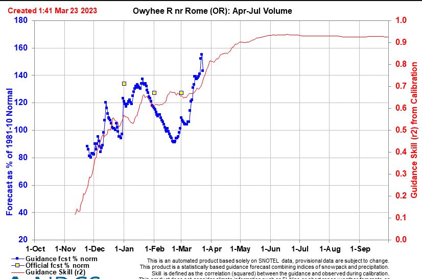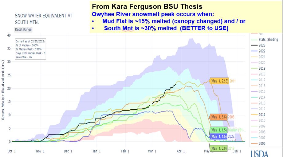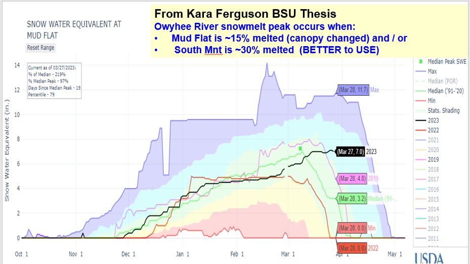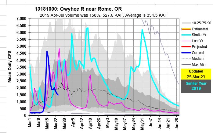The Owyhee River at Rome increased to 4600 cfs (mean daily flow) on Mar 16 from melting of valley snow and rain for its first peak since last year. The higher elevation snow is still accumulating, even at Mud Flat SNOTEL site which is only 5730 feet in elevations. March precipitation thru March 27 was 144% of median with another storm to continue building the pack as cold will remain until at least early April. Then, get ready as the cold temps will not last for ever…