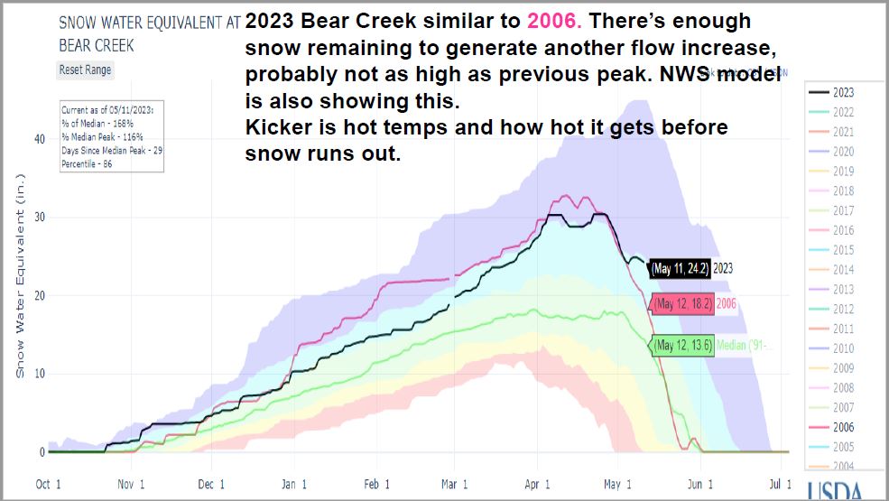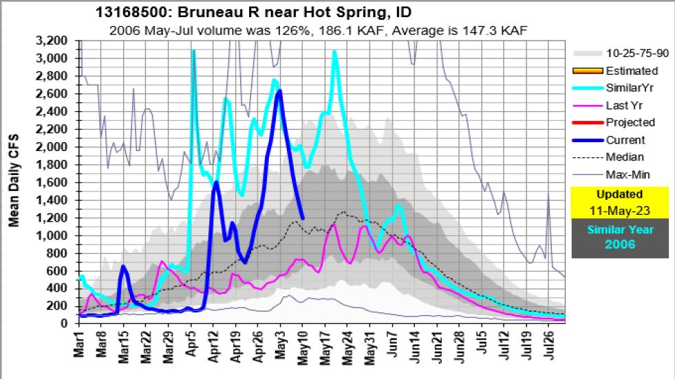 Here’s a short update, just dont tell Mike… The Bruneau is unique place, lets keep it that way. There’s enough snow to produce another increase, but the wild card are the extended period of hot temps. I didn’t look to see how much if any rain fell in May 2006 that added to flow increase.