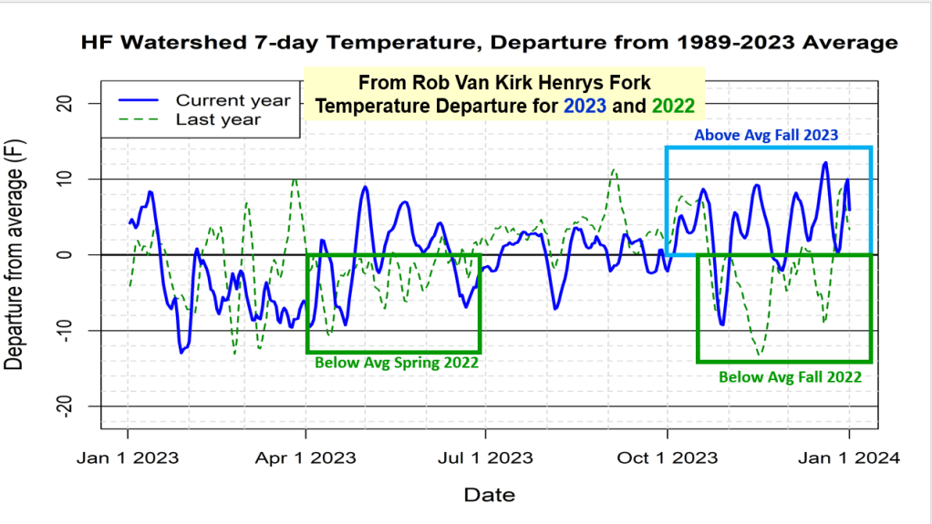 Here’s a summary of the interesting above normal streamflow we are seeing across southern half of the state. This was also observed and mentioned by others hiking, hunting and playing in the mountains this Fall. First I noticed the above average river flow levels and many rivers not freezing. So I had to dig deeper to figure out why and what happened as our Fall was fairly dry with temperatures on the warm and even record high side. Enjoy as we keep dreaming and learning about our rivers. Any other thoughts, let me know.