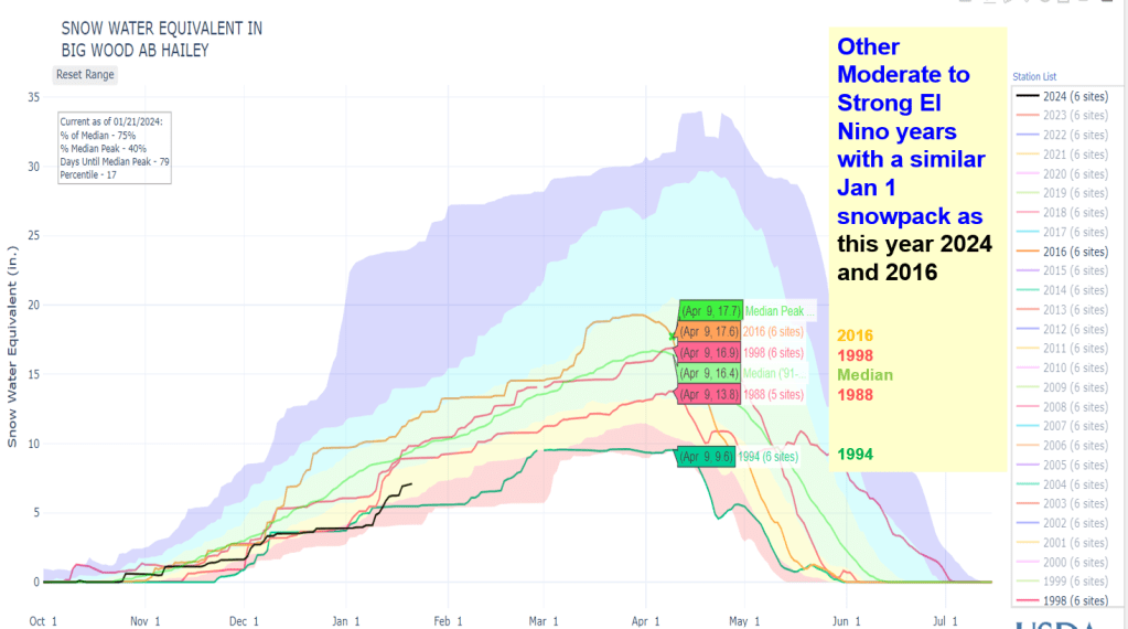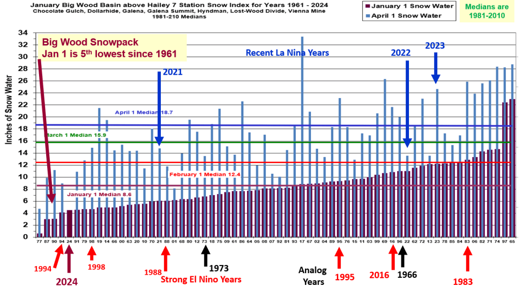 Following are long & short term snow analysis that illustrate the Jan 1 snowpack and how the snowpack ended the season Apr 1. Short answer – need more storms!