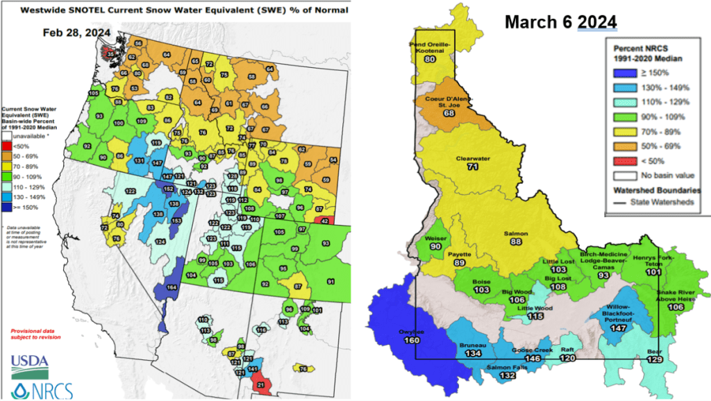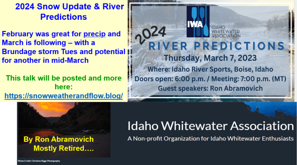 Snow & Flow Summary for many of Idaho’s whitewater rivers. Current snow, water supply forecasts, analog snow years, and runoff examples for these years. Example runoff years used, illustrate a early to normal snow melt and a late melt that had a wet spring (2010). Also included, is bonus sneak peak at next winter, the year after a strong El Nino year like this year. Here’s an updated March weather slide from Cliff Mass Blog that shows high pressure is likely to move into the West March 13-20. This may start the lower elevation rivers to flow depending on air temperature levels.