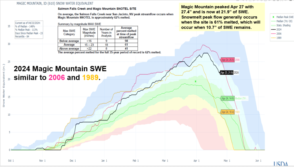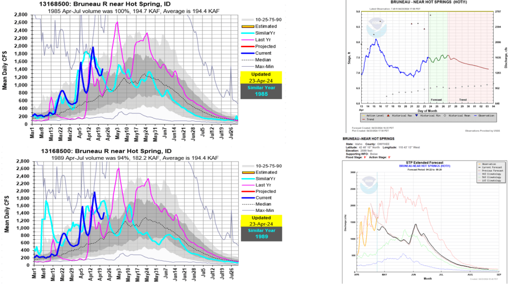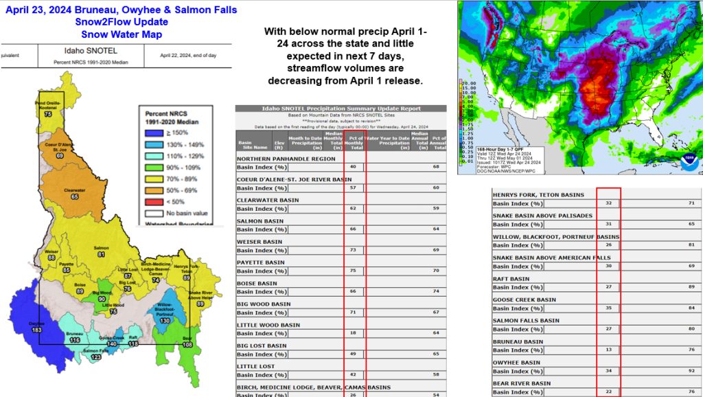 With below normal precipitation April 1-24 across the state and little expected in next 7 days, streamflow volumes are decreasing from April 1 release. The Owyhee River has peaked from snowmelt and remaining snow will help sustain flows. Remaining snow in Bruneau and Salmon Falls basins will produce another another flow increase. Future snowmelt rates and weather will determine if next flow increase exceeds the previous peaks already seen.