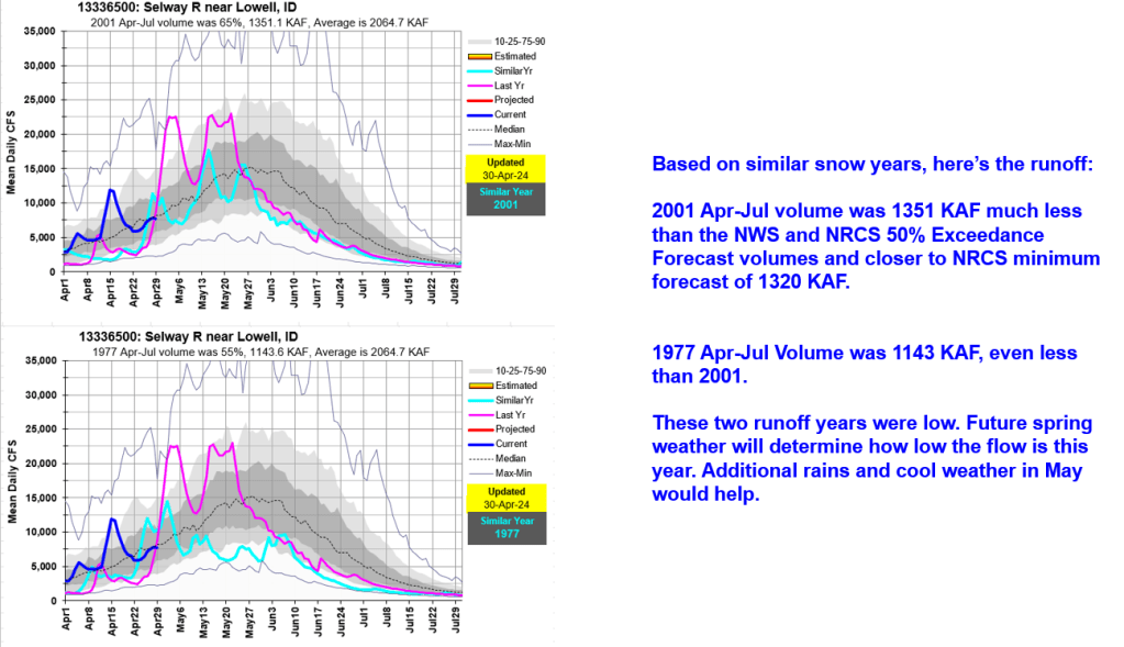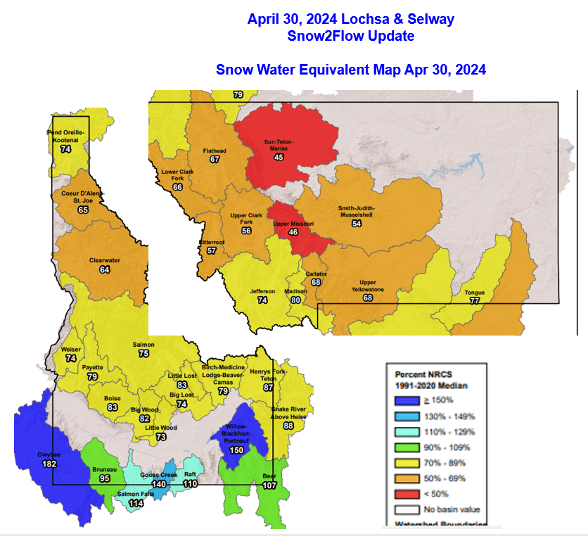 Lochsa & Selway Snow2Flow Update On April 30, 2024 By Ron Abramovich Low snow means low flows in these basins. Hopefully more weather moves in during the month of May snow2flow-lochs-and-selway-30apr2024Download Related