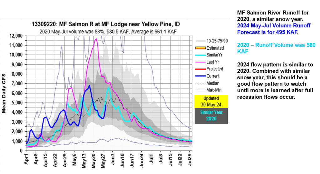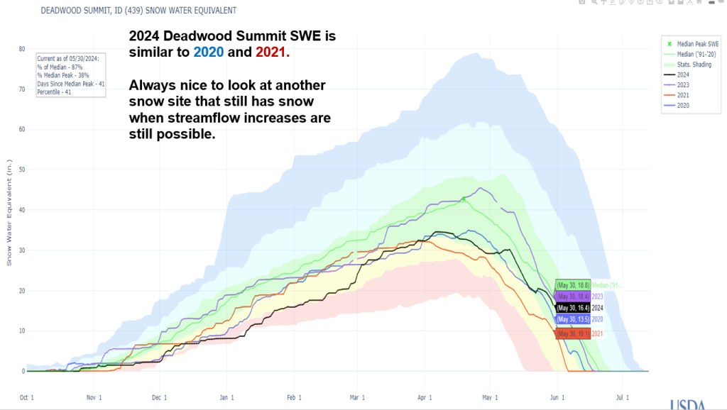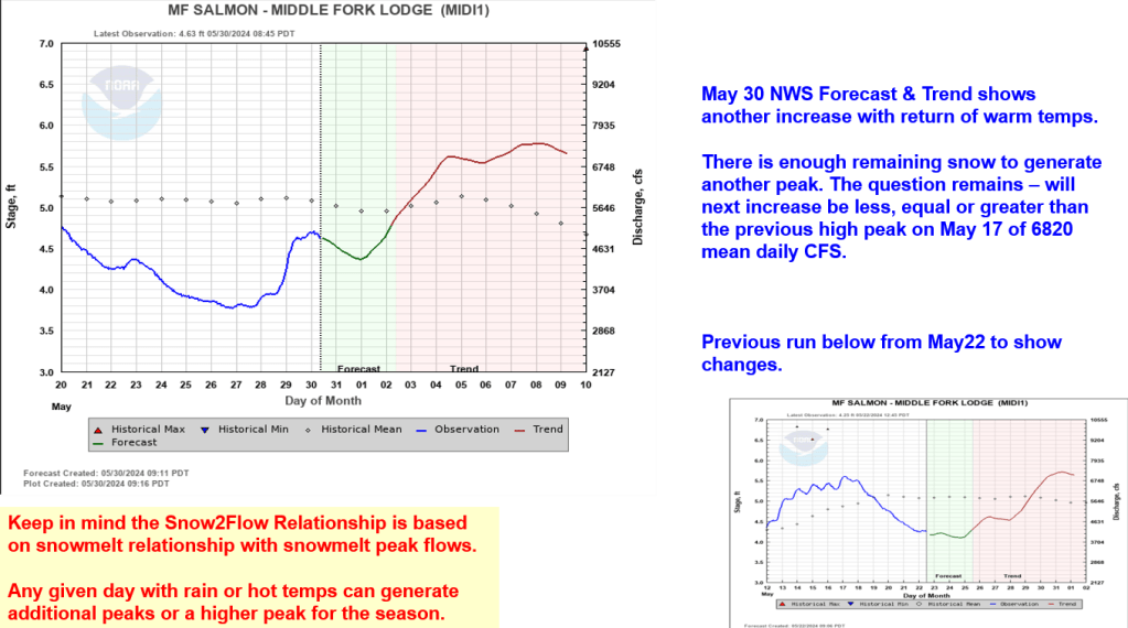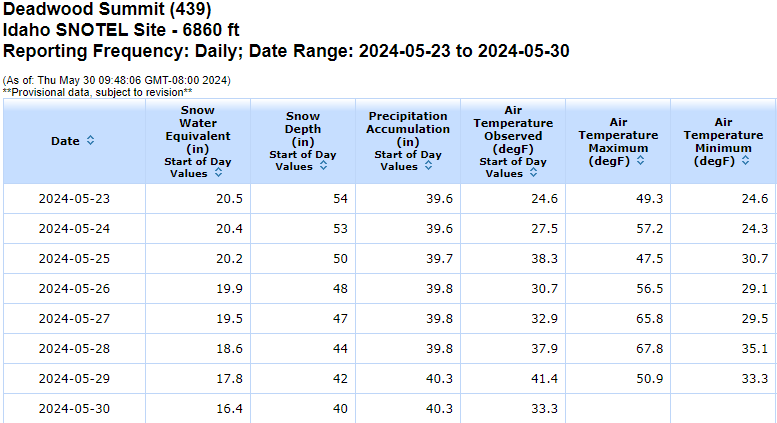 With the return of warm temps, rivers are rising again. The last cold front slowed the melt down to a few tenths per day and increased to 1.4″ yesterday with temps reaching 67 F at Deadwood Summit. With these yoyo like temps and some precipitation remaining in forecast, expect a few more ups n downs in flow levels before full recession starts.
