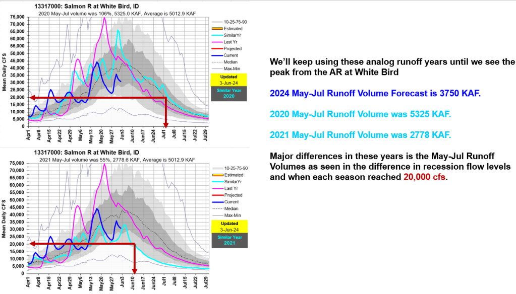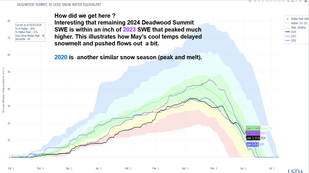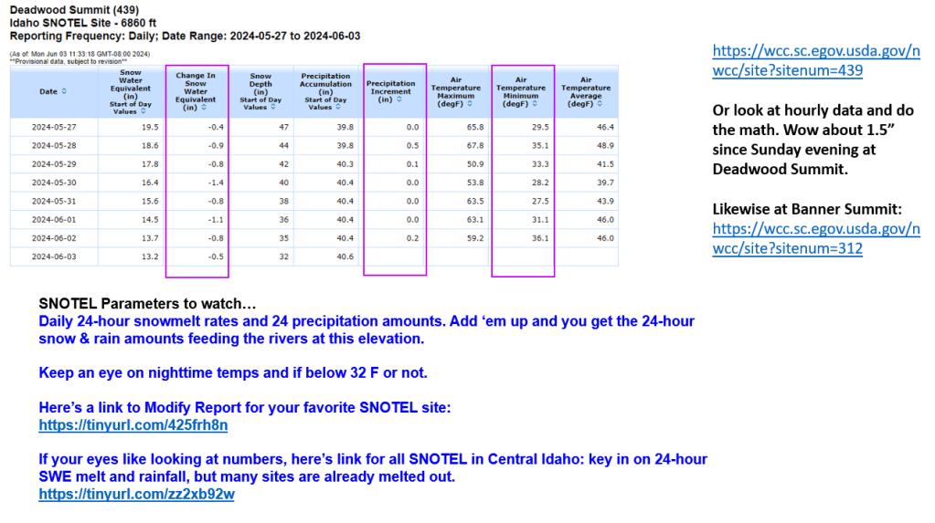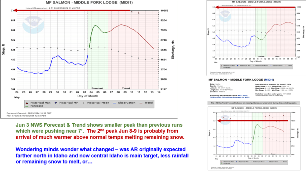 Here’s an update based on current info. We’ll see later today and tomorrow how high these rivers peak. Here’s a link to previous post to project flow levels on your launch date for MF & Selway. Give it a try and see if still works after the peak has occurred. No cheating, wait for the peak… and play it safe. https://snowweatherandflow.blog/2022/06/19/mf-salmon-and-selway-rivers-recession-flow-estimation-tool-for-use-after-peak-flows-have-occurred-and-river-is-in-full-recession/
