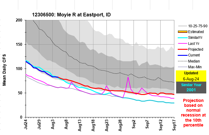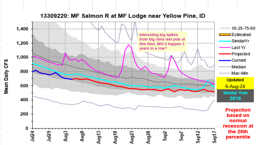 MF has leveled off flowing less than last year and similar to 2016. The headwater of the Snake River is pushing record low flows based on 40 years of data. Salmon Falls Creek is usually one of the first rivers to bottom out in late summer / early fall and the flow starts increasing with the longer, cooler nights and reduced water up take from plants.