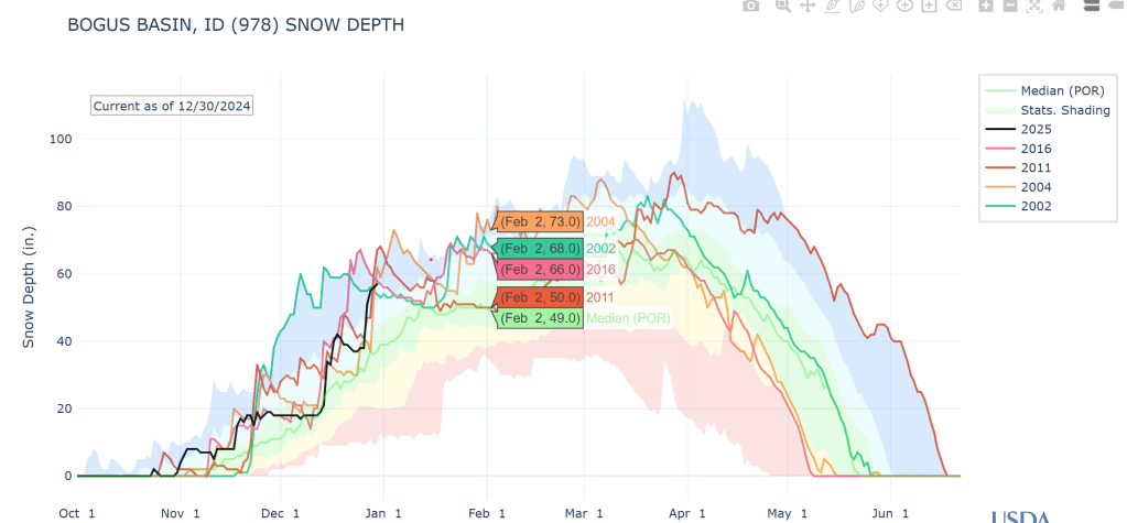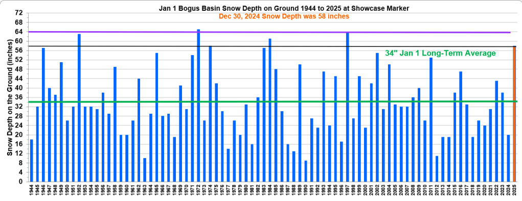 Updated graph Jan 2 with Dec 30 Snow Depth measurement value of 58” for the long-term snow course at the Showcase Marker. This winter is off to the best start since 2011 and in the top 5 highest years since daily snow depth measurements start in 2000.