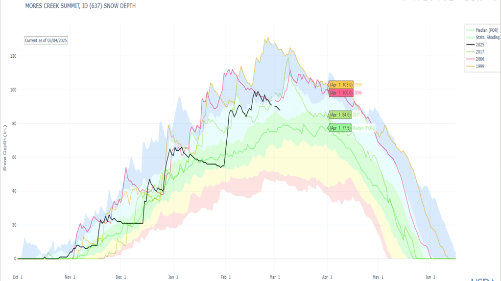 February brought snow measured in feet. A summary of snow depths at many ski locations across the state follows. Here are some quick facts about February’s snowfall at Bogus Basin. March 1 Bogus Basin snow depth of 83″ is the 11th deepest since 1944. SWE increase of 8.7″ during February was the 8th highest since measurements start in 1944. The snow depth on Feb 1 was 50″ and increased to 83″ by months end; this is tied for 2nd greatest change with 1949. February 2019 was huge with an increase from 36″ to 95″ by the end of February.