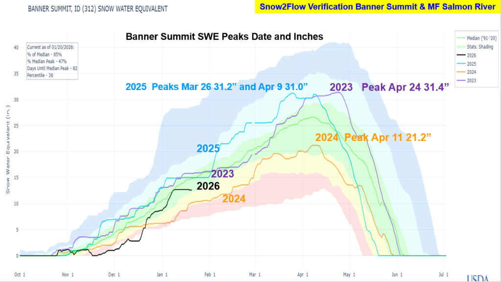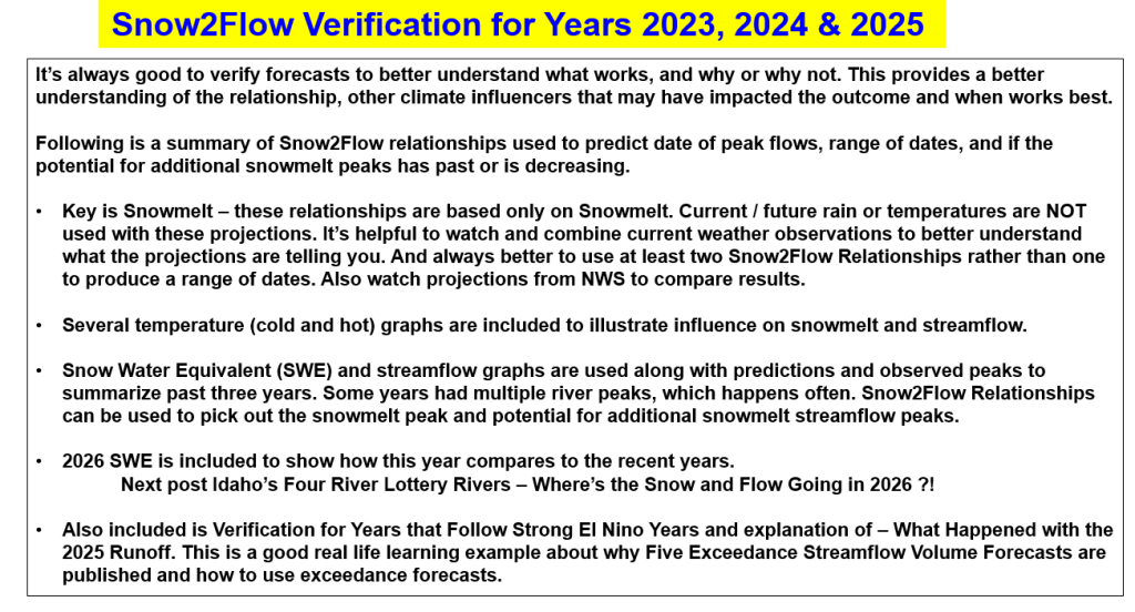 Snow & Flow graphs illustrate what happened and how the predictions preformed. 2026 SWE is also include to give you a hint how this winter is tracking these recent years. Next post Idaho’s Four River Lottery – Where’s the Snow and Flow Going in 2026 ?!