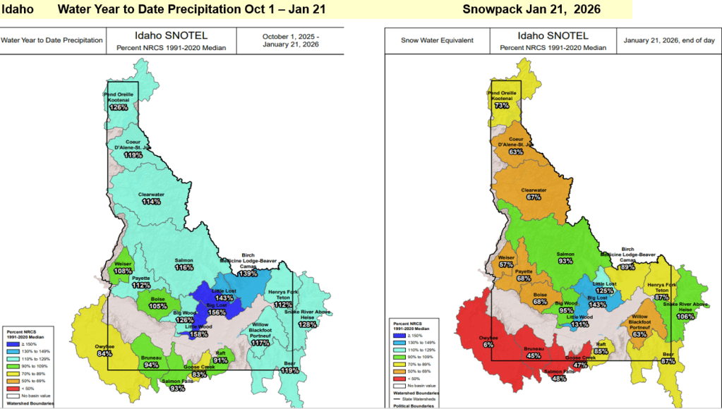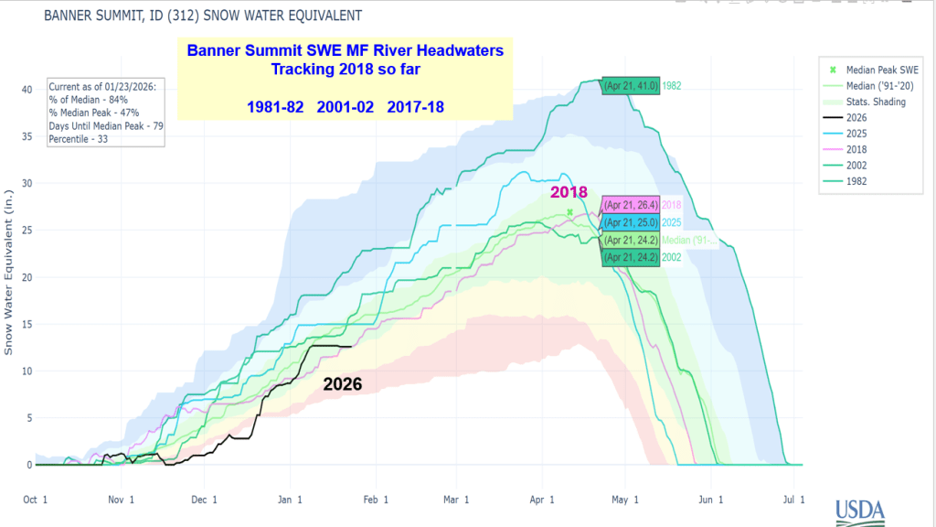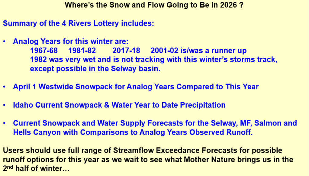 Here’s a summary of current snow water supply conditions for Idaho’s 4 River Lottery Rivers. Short on time for complete analysis but this should provide current info about the accumulation of this winter’s unique snowpack and where we are compared to other years.