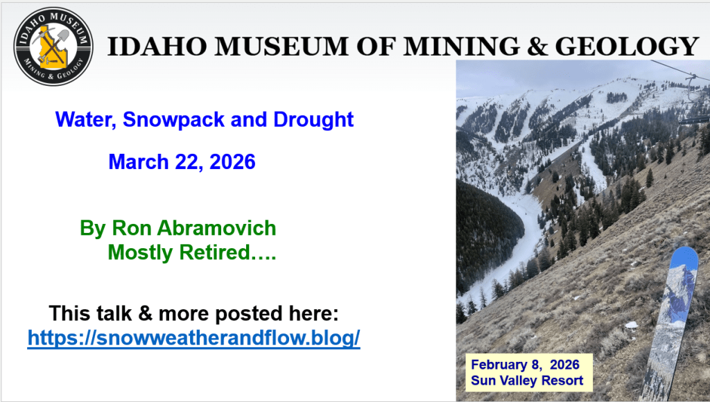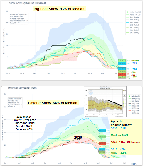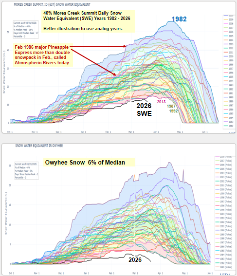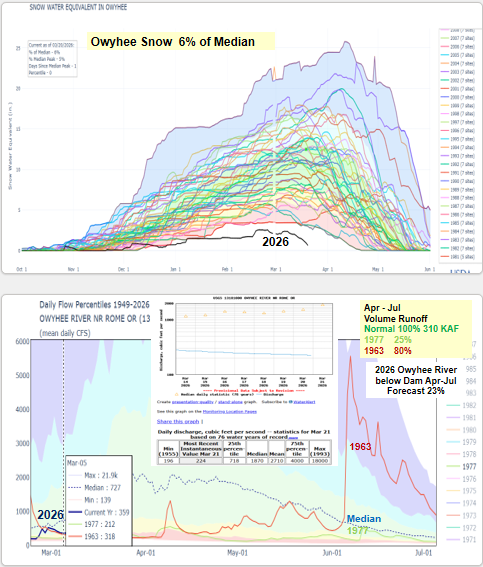 Mid-March heat dome is melting Idaho’s snow way too earlier. Even the higher elevations are starting to melt and rivers are rising. Here’s an update of how we got here and the 3-D Drought that put us in this unique position. Winter 2026 will be remembered as a winter with near normal water year to date precipitation, elevation distributed snowpacks, warm temps and now a spring heat dome that is melting the snow and pushing rivers up, except in the Owyhee because there is very little snow to melt. Let’s hope cooler weather returns by month’s end and a few cool wet storms in Aril arrive to save our remaining higher elevation snow to melt later this spring. A wet spring is needed this year. Another record dry Apr-May-Jun like last year, would not be good. Spring rain are needed now while the snow is melting to increase runoff. Even a late spring rain event like the one that occurred June 1, 1963 pushing the Owyhee River up to 5000 cfs, would be sweet. 1963 is an analog year for this year which also had very low snow runoff in the Owyhee. Lessoned learned from watching Owyhee River runoff – it often sets the stage for runoff trends seen elsewhere in southern Idaho.