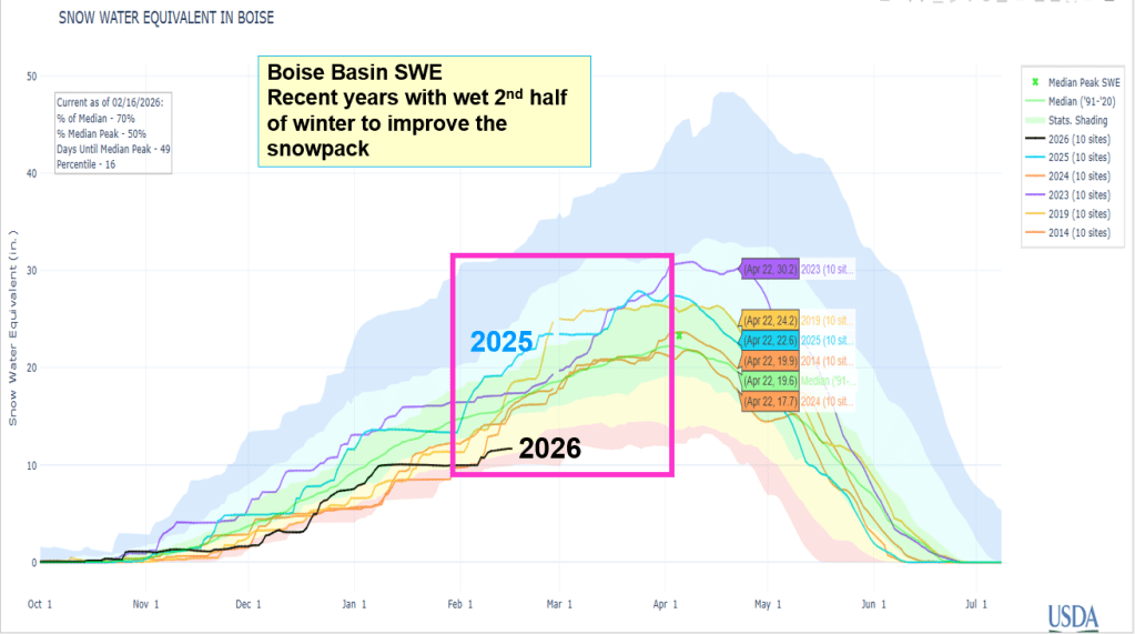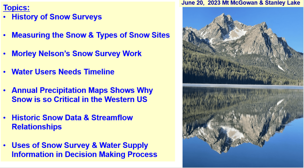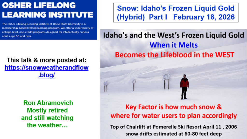 Here’s a summary of the 2025 runoff, the fall and early winter weather that created the unique elevational distribution of the snowpack and water supply outlook for the Payette, Boise & Owyhee basins. This talk was for the Idaho Alfalfa & Seed Growers Conference.