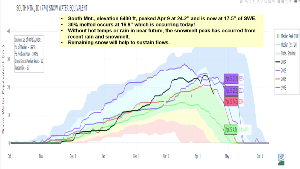 Following are several graphs illustrating current snow levels and similar years along with resulting runoff. The Owyhee – based on snow2flow relationship just had a snowmelt peak. More rain and warmer temps will produce more peaks. Weiser – always interesting watching the Weiser River react to current conditions as we wait and watch to try to figure out how the higher elevation basins in the state will flow. Camas Creek lots of snow to melt. Bruneau is looking good along with Salmon Falls Creek. Is Banner Summit reaching its peak? Time will tell and then we’ll see how headwaters snow melts and the mighty Salmon River responds. Be safe and know your boating limits.