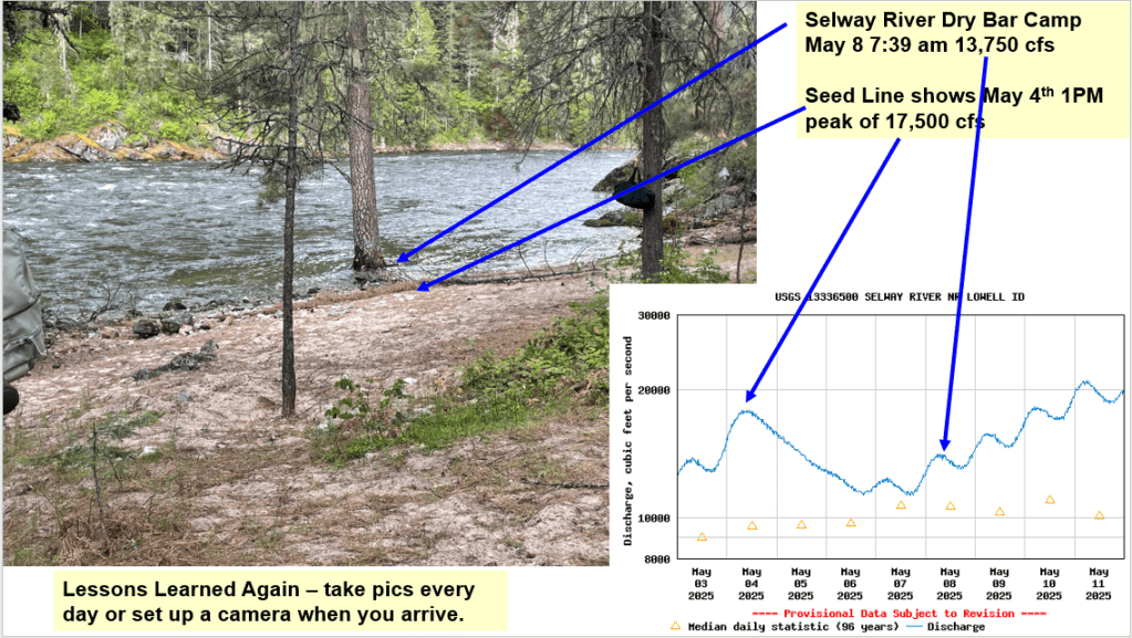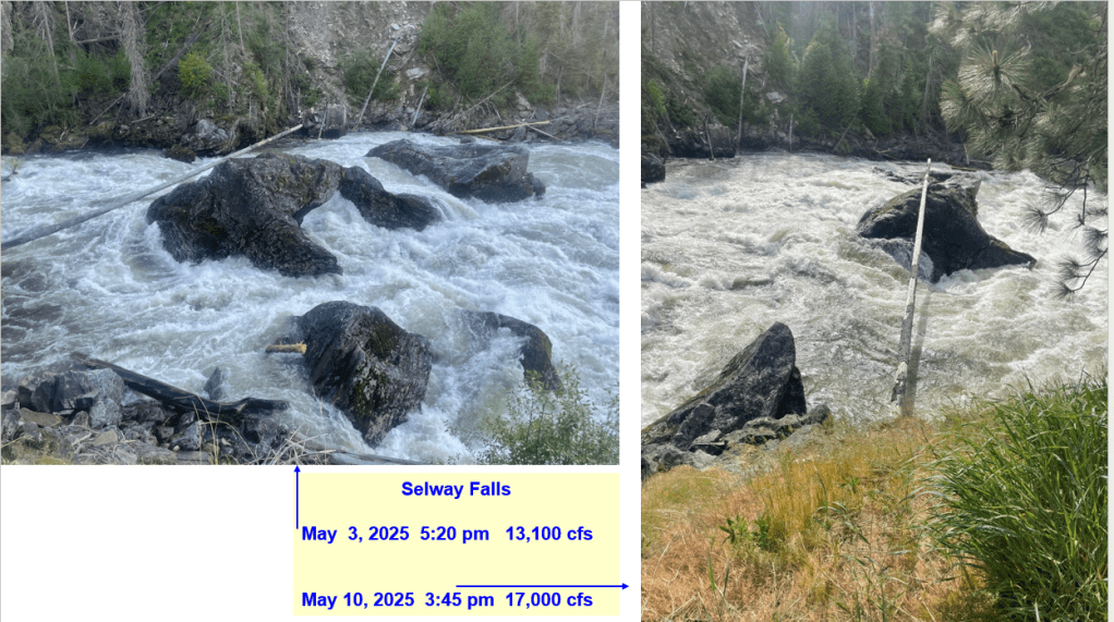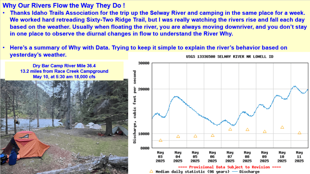 Thanks Idaho Trails Association and letting me camp, work and watch the Selway River rise and fall this May. Here’s a summary about the climatic conditions (daily/weekly weather, cold & warm fronts, record high day & non-freezing night temps, snowmelt rates, lack of spring precipitation) that produced this spring’s Selway River hydrograph shape. It’s a complex world out there. Hopefully this helps explain the diurnal river changes and why our rivers flow the way they do as our winter snowpack melts in the spring.
