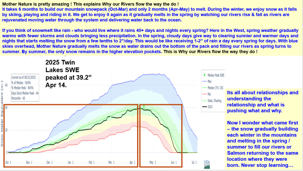 With the return of warm temps, rivers are rising again. The last cold front slowed the melt down to a few tenths per day and increased to 1.4″ yesterday with temps reaching 67 F at Deadwood Summit. With these yoyo like temps and some precipitation remaining in forecast, expect a few more ups n downs in flow levels before full recession starts.