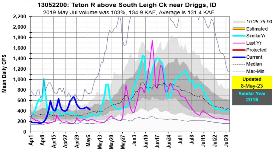 The Teton River is always interesting to watch because of its tight relationship with Grand Targhee SWE. Based on melt at other similar years, snowmelt peak flow may not occur until June 1-15.